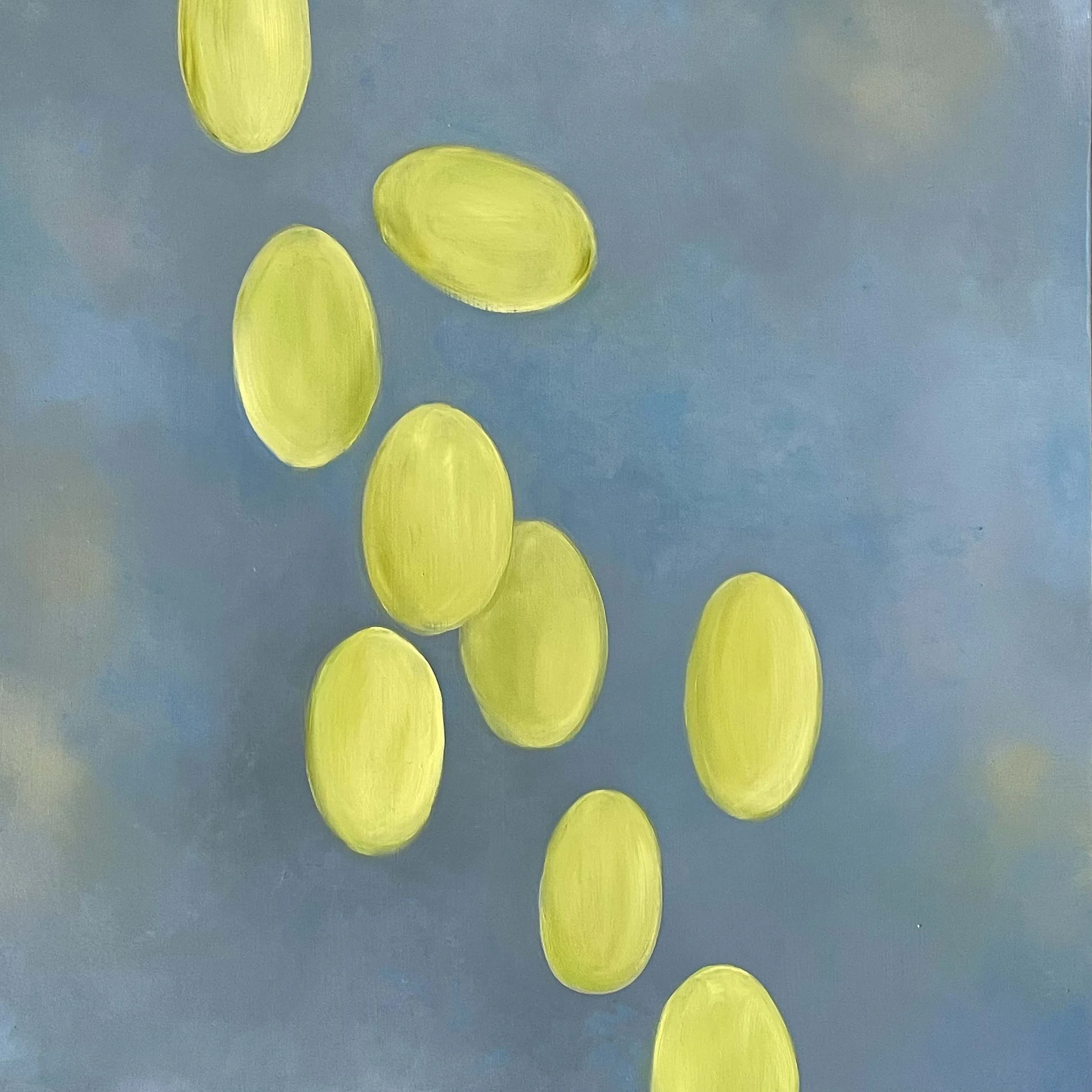 “The concept of seed thoughts is derived from the phenomena of orbs or shapes of light that appear in paranormal psychology. Interestingly, Sanskrit refers to these as ‘seed thoughts’. For me, these shapes are pleasing, and offer a vehicle for exploring movement, luminosity and colour harmony. They give rise to my own thoughts of opening to higher energies and proceeding forward with love, light and hope.”